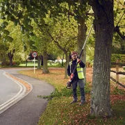 Telescopic battery pole saw for professionals, with 5m telescopic reach and performance that surpasses petrol equivalents. Maximum performance and durability with low weight, excellent ergonomics and quiet operation for use in any location at any time of day.
