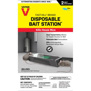 Each Victor Fast-Kill Disposable Bait Station - 2 Pack - comes pre-filled with a single-feed non-anticoagulant rodenticide. Simply place each bait station in areas of high rodent activity. The dual-entry tunnels are designed with rodent travel habits in mind to encourage interaction with the bait station. For peace of mind, this bait station is constructed with a child-resistant plastic housing that won't open. Active ingredient: Bromethalin.